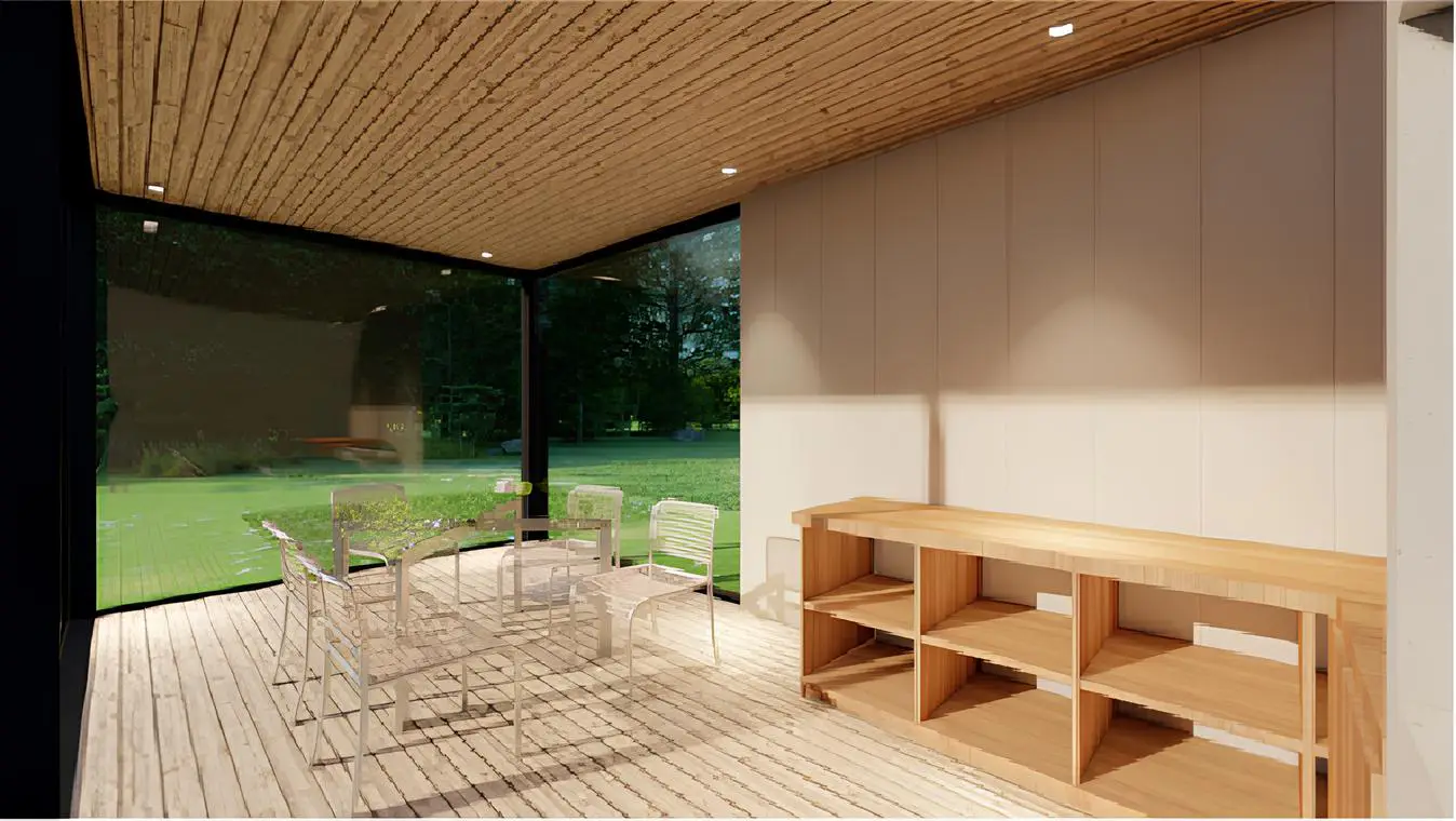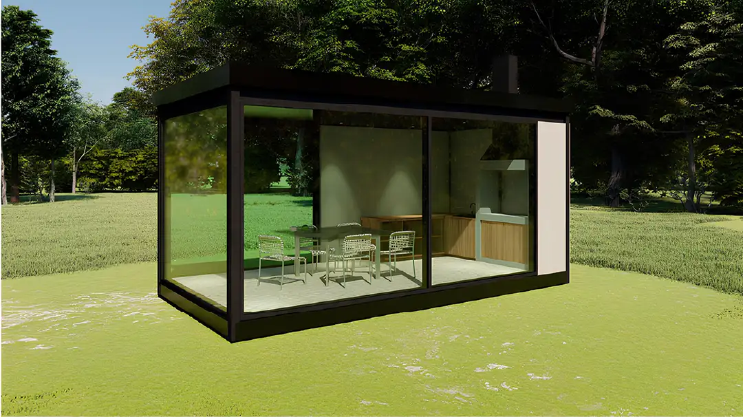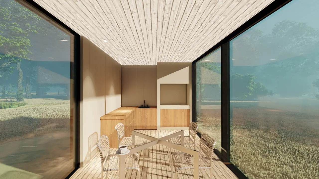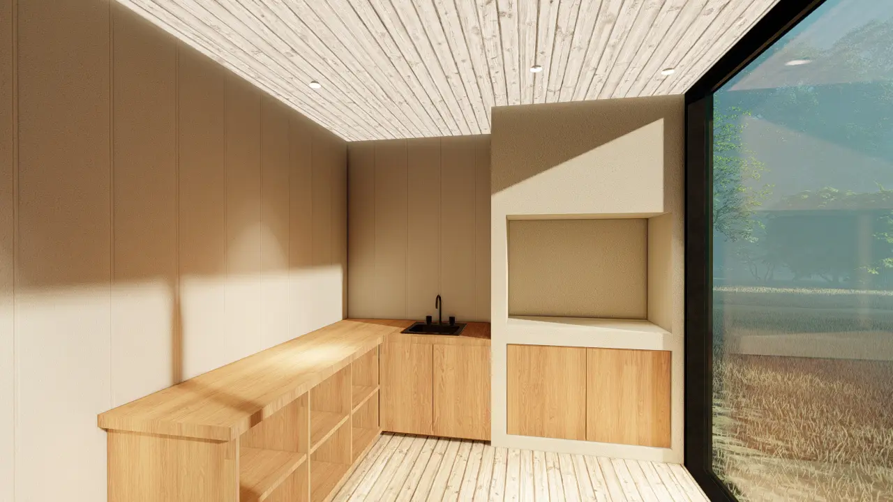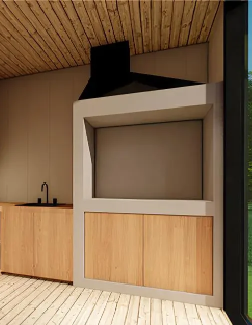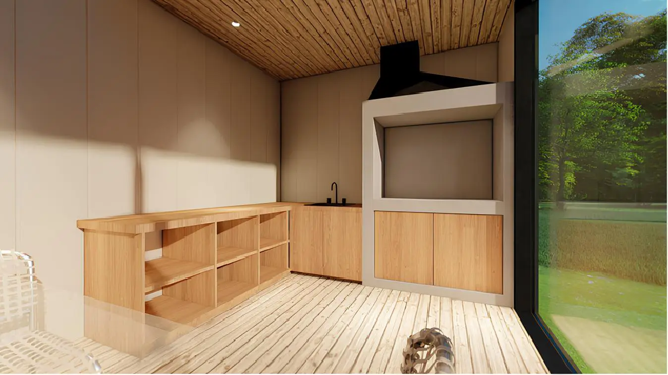 Este módulo está diseñado para quienes buscan disfrutar de asados y reuniones al aire libre. Equipado con una parrilla de hierro y ladrillo refractario, junto con una campana para ventilar el humo, es ideal para cocinar cómodamente. Incluye mesadas para preparar y servir alimentos. Con ventanales en todo su alrededor, el módulo ofrece una excelente ventilación y una vista panorámica Conectando fluidamente con el entorno.